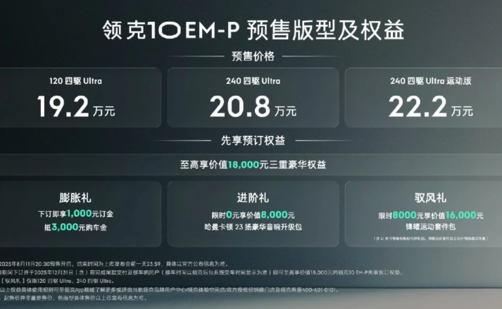 为进一步降低消费者的购车决策门槛,领克 10 EM-P 在预售阶段推出了针对性的权益政策。其预售价设定为 19.2 万元起,同时提供至高价值 18000 元的三重豪华权益,涵盖购车优惠、服务保障等多个维度。在订单政策上,采用 “早订早交付、不锁单可退” 的灵活机制,精准解决了当前消费者购车时的核心顾虑。对于计划从传统燃油车转向新能源车型的用户而言,“选错车型”“权益无法兑现” 是常见的决策障碍,而 “可退订” 政策为这部分用户提供了更多试错机会,降低了购车风险。在产品版本划分上,领克 10 EM-P 根据不同使用场景推出 3 个版型:120 四驱 Ultra 主打城市通勤与短途郊游需求,240 四驱 Ultra 侧重长途出行与长续航能力,240 四驱 Ultra 运动版则聚焦精致设计与豪华配置体验。这种基于用户场景的细分定位,确保每位消费者都能找到匹配自身需求的车型,进一步强化了 “无需妥协” 的产品定位。