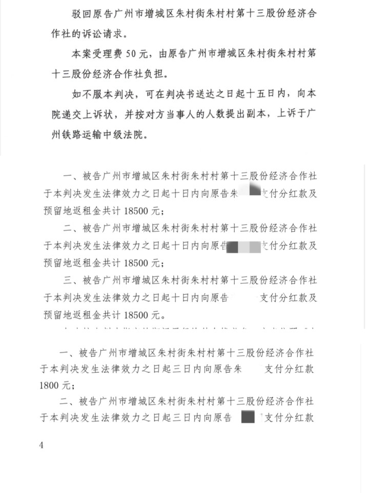2024年,朱女士起诉要求朱村十三社分别向其及两个孩子支付2022年1月至2024年3月的分红款18500元。判决书显示,庭审时,朱村十三社没有答辩。朱女士的诉讼请求获得了增城区法院的支持,她和两个孩子分别获得朱村十三社的分红款18500元。因朱村十三社未主动履行生效判决义务,朱女士申请了强制执行,获得了这笔分红款。