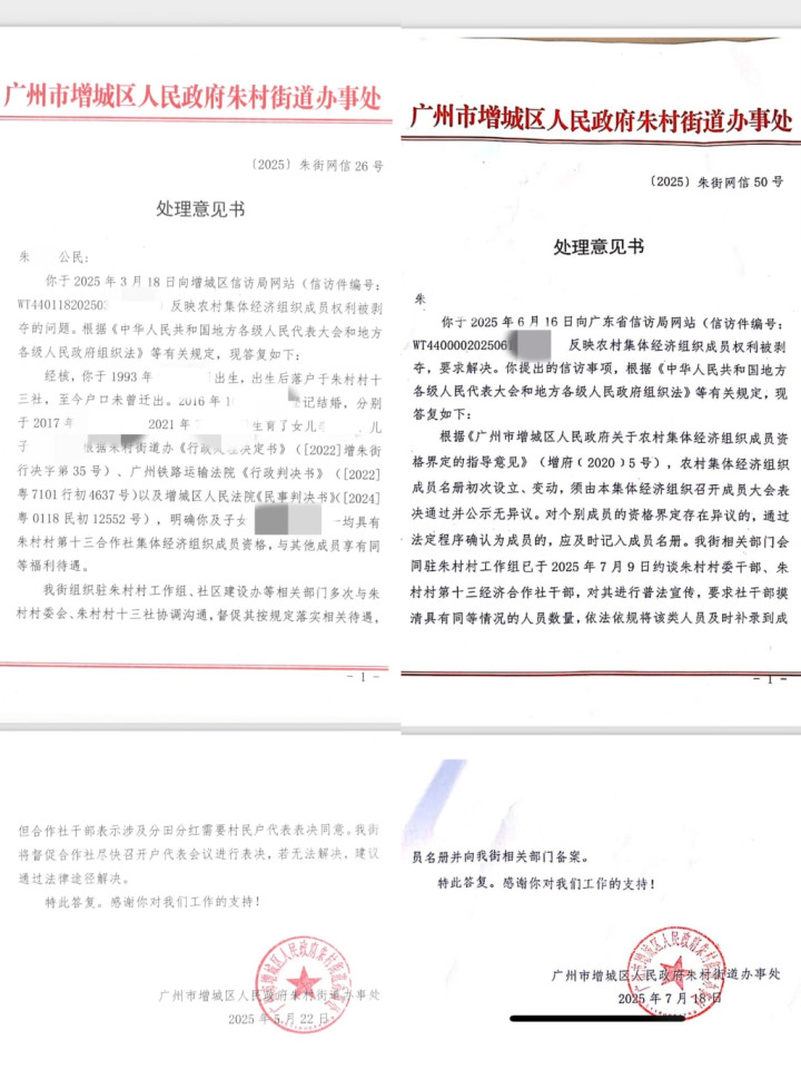 2025年7月,朱村街道办答复称,该街道相关部门会同驻朱村村工作组已于2025年7月9日约谈朱村村干部、朱村十三社干部,对其进行普法宣传,要求社干部摸清具有同等情况的人员数量,依法依规对该类人员及时补录到成员名册并向街道相关部门备案。