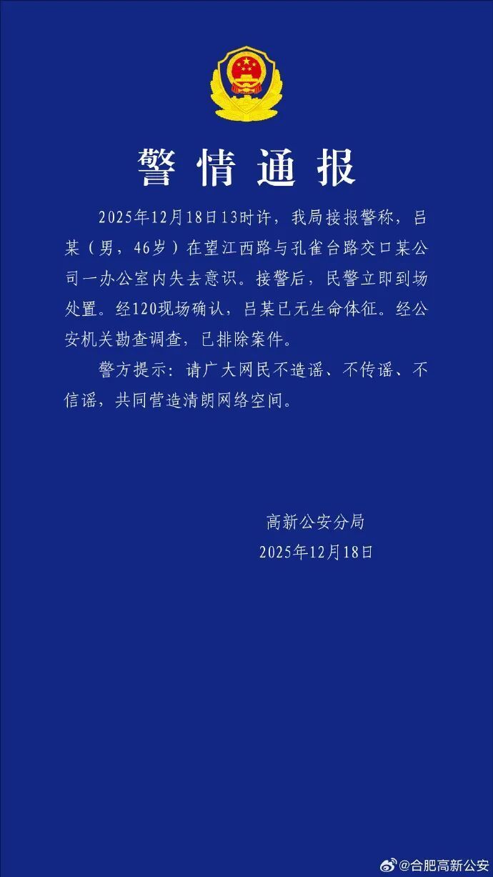 2025年12月18日13时许,我局接报警称,吕某(男,46岁)在望江西路与孔雀台路交口某公司一办公室内失去意识。接警后,民警立即到场处置。经120现场确认,吕某已无生命体征。经公安机关勘查调查,已排除案件。