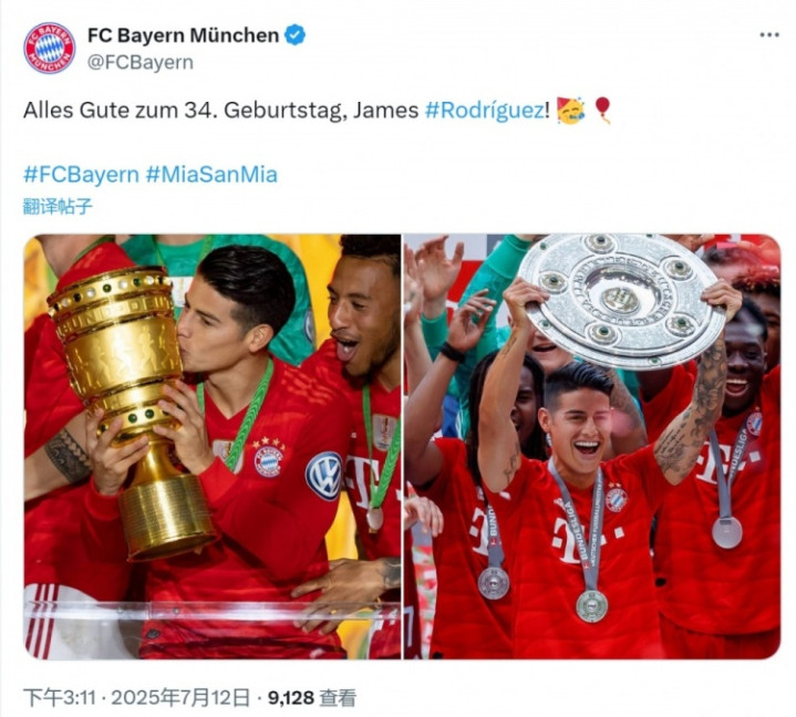 直播吧7月12日讯今天是哥伦比亚球星哈梅斯-罗德里格斯的34岁生日,老东家拜仁为他送上祝福。