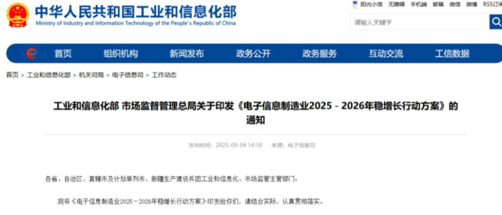 今年9月,工业和信息化部、市场监督管理总局印发《电子信息制造业2025-2026年稳增长行动方案》,提出2025-2026年,规模以上计算机、通信和其他电子设备制造业增加值平均增速在7%左右,加上锂电池、光伏及元器件制造等相关领域后电子信息制造业年均营收增速达到5%以上。